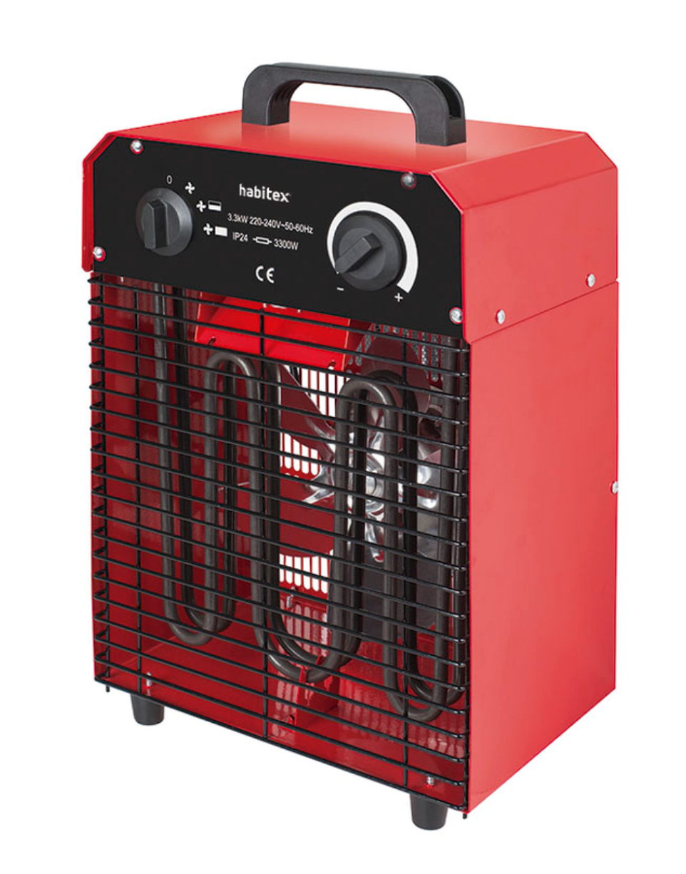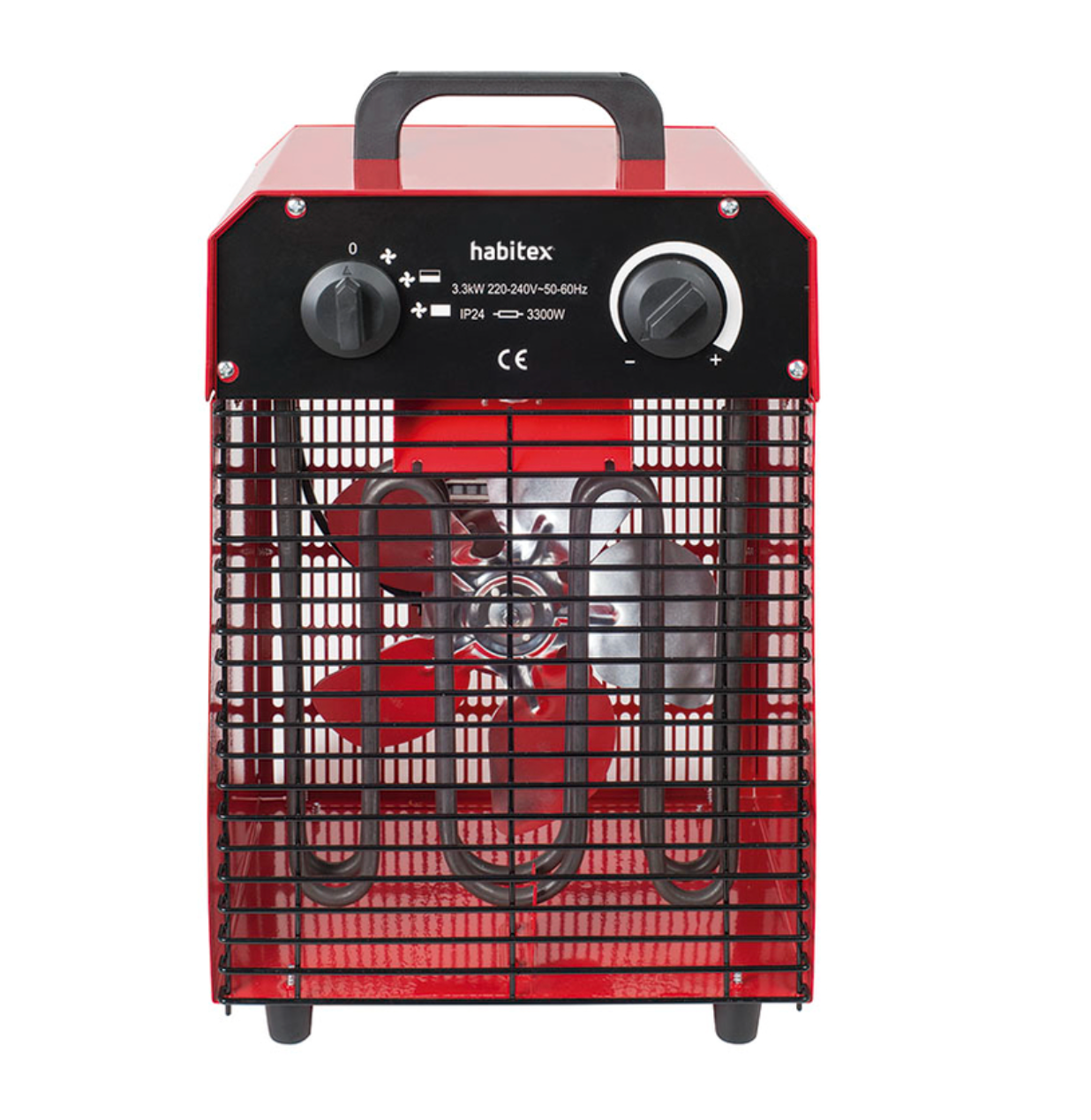 Cuenta con dos niveles de potencia (1650 / 3300 W) y un termostato regulable de 0 a 85 ºC, permitiendo ajustar la temperatura según las necesidades. Su asa de transporte facilita el desplazamiento entre estancias, mientras que su protección contra salpicaduras IP24 asegura un uso seguro en exteriores o espacios húmedos.